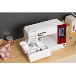 Plaque pour tige de bouton, point pivot pour couture circulaire, guide de quilting, canettes, découds-vite, assortiment d'aiguilles, pinceau de nettoyage, disques fixe bobines, tige porte bobine supplémentaire, tournevis petit, stylet pour écran tactile, housse de protection semi-rigide.